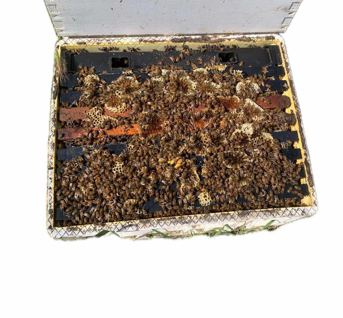 These ten frame singles have 10 fully drawn frames of bees, each single contains a freshly mated queen. At least six of the frames are filled with healthy brood and eggs, indicating a strong and productive colony.
