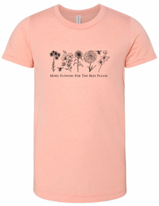 Soft peach pink tee with floral graphic and "More flowers for the bees please" available in Youth and Adult sizes