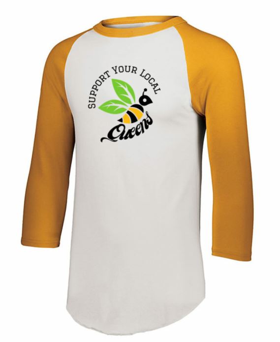 Three-Quarter Sleeve Baseball Jersey in White and Gold with Tree City Bee Company Bee as part of the "Support your local Queens" design. Available in Adult S-4X