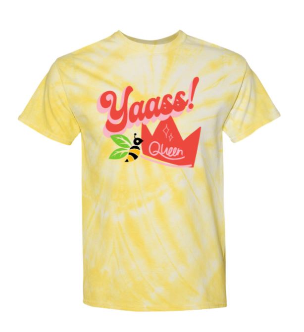 Yellow Tie-Die shirt includes Tree City Bee Company Bee as part of the "Yaass Queen" Design. Available in Youth and Adult sizes